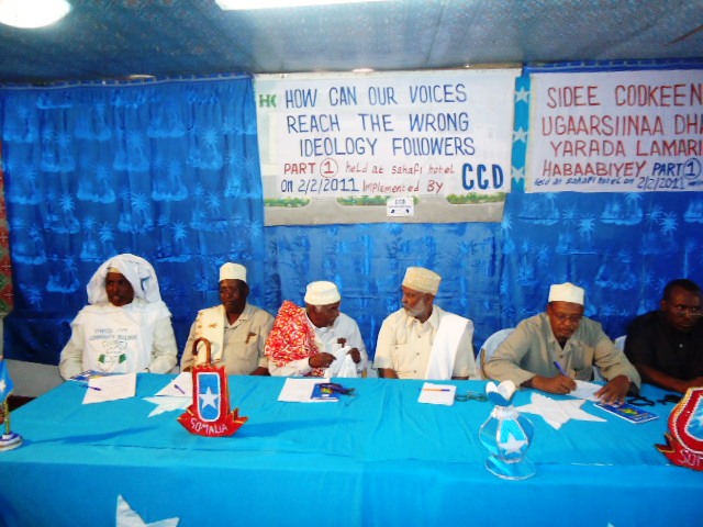 Arbaco, 02 Feberaayo, 2011 (HOL) – Hay'adda CCD, ayaa maanta uga furtay hotel Saxafi ee Muqdisho 150 oday-dhaqameed siminnaar ku saabsan nabadda. Waxaana furitaanka siminnaarkaas kasoo qayb-galay xildhibaanno baarlamaan, iyo marti sharaf kale, kuwaasoo khudbado kala duwan u jeediyay ka qaybgalayaashii siminnaarka.