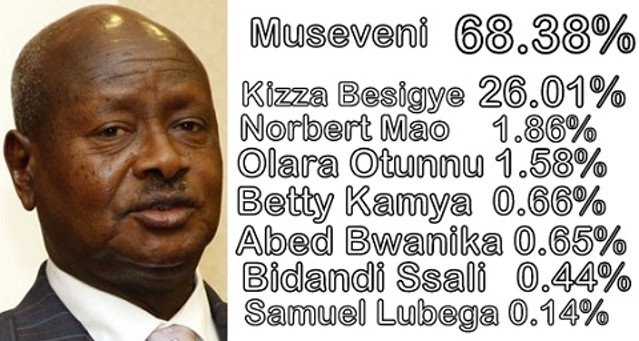 Guddoomiyaha guddiga doorashada Bedru Kigunddu ayaa ku dhaawaacay in madaxwene Museveni uu si rasmi ah ugu guuleystay doroashadii ka dhacday wadanka, isla markaana uu helay 5,428,369 (68.38%), sidaana uu mar kale ku noqday Madaxweynaha Jamhuuriyada Uganda 5-ta sano ee soo socta.