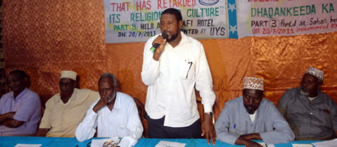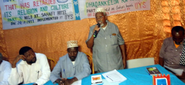 Arbaco, July 20, 2011 (HOL) – Dood looga hadlay sidii Bulshada Soomaaliyeed ay ugu dhaqmi lahayd diinteeda iyo dhaqankeeda ayaa maanta loogu qabtay Hotelka Saxafi ee Magaalada Muqdisho. Odayaasha dhaqanka iyo waxgaradka Soomaaliyeed kaasoo ay soo qaban-qaabisay Midowga dhalinyarada Soomaaliya (UYS).