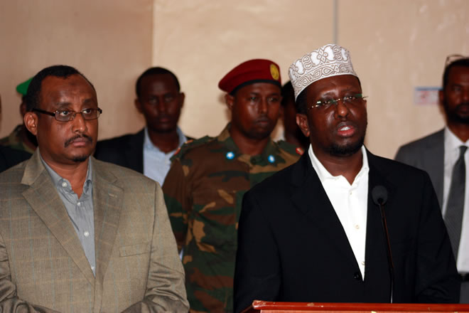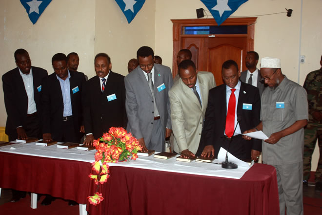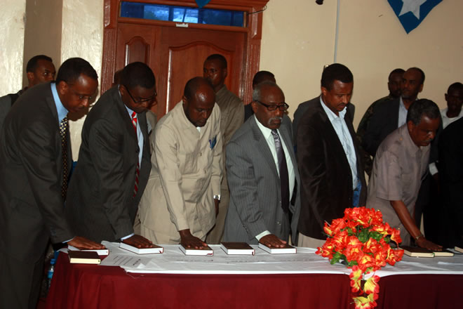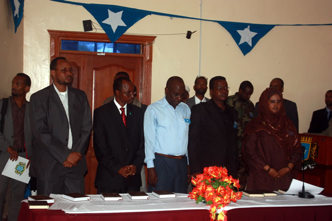 Khamiis, July 28, 2011 (HOL) – Xaflad lagu qabtay xarunta madaxtooyada dowladda KMG ah ee Soomaaliya maanta oo Khamiis ah ayaa lagu dhaariyay wasiirrada xukuumadda KMG ah ee intooda dalka ku sugan, iyadoo dhaarintaas ay goob-joog ka ahaayeen madaxweynaha Soomaaliya, ra'iisul wasaaraha iyo guddomiyaha baarlamaanka.