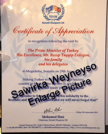 Waxaana dhambaal mahad celin ah oo loo diray Ra’iisul wasaare Erdogan ku saxiixnaa madaxa Soomaalida Qurbo-joogta ah ee dalka (UK) Maxamed Cilmi., kaasoo loo gudbiyay safiirka u jooga dalka Turkiga waddanka Britain oo ay ku booqdeen safaaradda Turkiga.