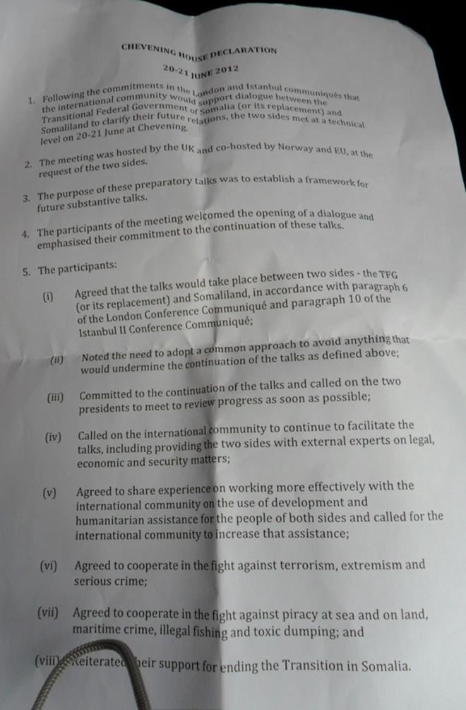 Khamiis, June 21, 2012(HOL): Shirkii Somalia iyo Somaliland labada maalmood uga socday Magaalada London ee dalka Britain ayaa la soo gebagebeeyay, iyadoo shirkana ay soo baxeen qodobbo dhowr ah, kuwaasi oo ay labada dhinac ku heshiiyeen.