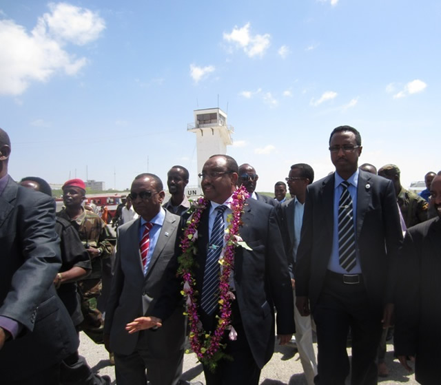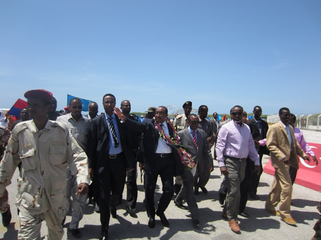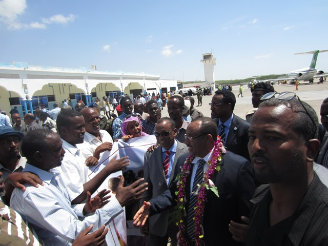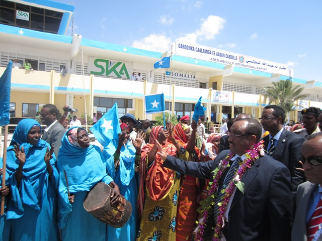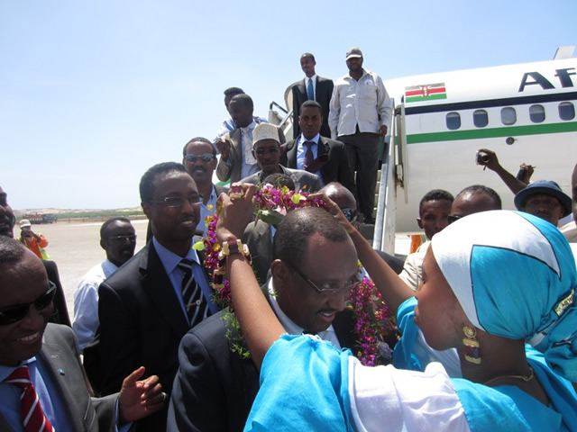 Axad, Maarso 11, 2012 (HOL) — Ra’iisul Wasaaraha Soomaaliya Prof Cabdiweli Maxamed Cali ayaa maanta dalka dib ugu soo laabtay ka dib safaro shaqo oo uu ku soo kala bixiyey dalal fara badan. Ra’iisul Wasaaraha iyo wafdigii la socday ayaa si heer sare ah loogu soo dhoweeyey garoonka diyaaradaha Caalamiga ah ee Aadan Cadde, halkaas oo ay ku soo dhoweeyeen Ku-Simaha Ra’iisul Wasaaraha, Wasiiro, xildhibaano, Guddoomiyaha Gobolka, ururada Haweenka Gobolka Banaadir iyo shacabka Soomaaliyeed.