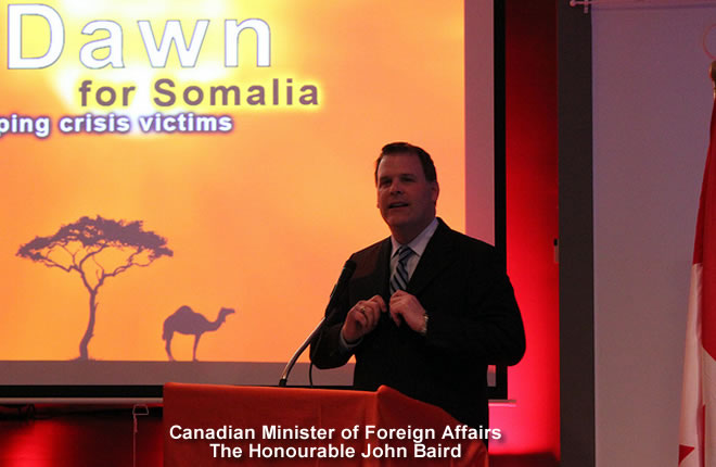 Wasiirka arrimaha dibadda ee dalka Canada, John Baird oo isaguna hadal jeediyay ayaa wuxuu sheegay in dowladda Canada ay mar walba garab taagan tahay kaalmeynta ummadda Soomaaliyeed. Isagoo xusay in shacabka iyo dowladda Canada ay ku kaalmeeyeen abaarihii ka dhacay dalka Soomaaliya dhaqaale gaaraya $145 Million oo Dollar.