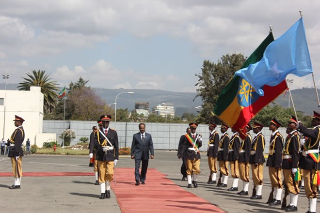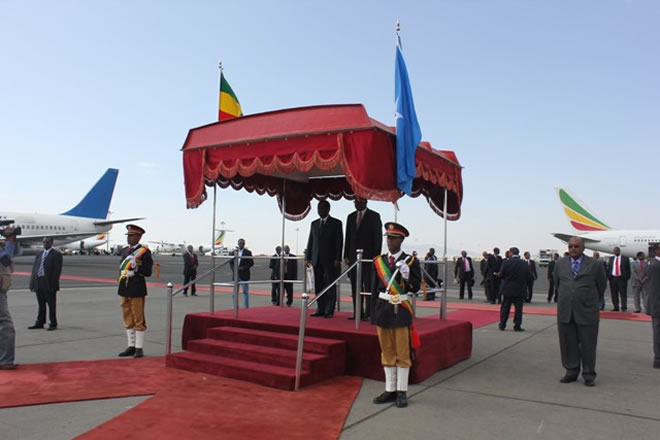 Madaxweeynaha Jamhuuriyadda federaalka Soomaaliya ayaa loo gelbiyay xarunta madaxtooyada Itoobiya kadib markii uu salaan sharaf ka gudoomay ciidamada Baambeeyda dalka Itoobiya.