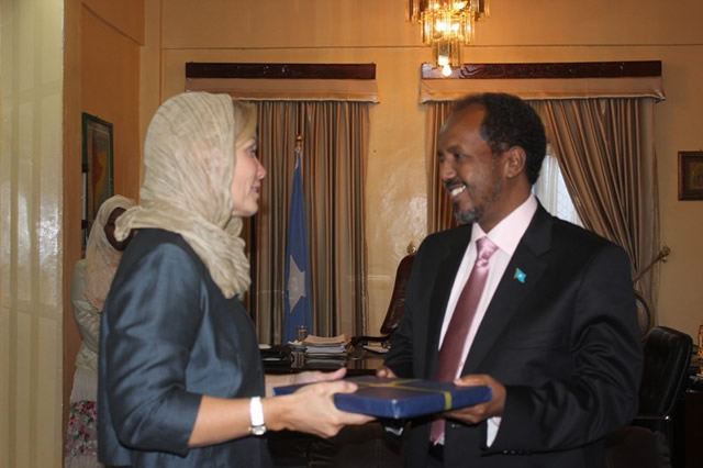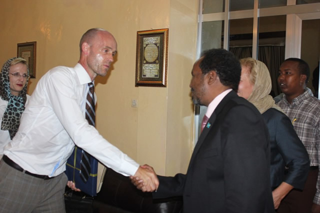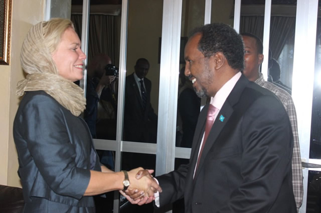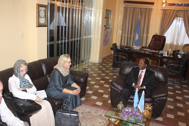 Talaado, September 18, 2012(HOL): Madaxweynaha Jamhuuriyadda Federaalka ah ee Soomaaliya mudane Xasan Sheekh Maxamuud ayaa maanta xafiiskiisa ku qaabilay wasiirka horumarinta xiriirka caalamiga ah ee dalka Sweden Gunilla Carlsson iyo xiriiriyaha arrimaha bani’aadamnimada ee Qaramada Midoobay Mark Bowden.