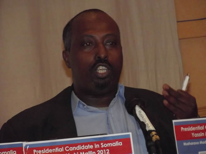 Axad, July 08, 2012(HOL): Siyaasiga Yaasiin Maaxi Macallin ayaa musharaxnimadiisa madaxweynenimada Soomaaliya kaga dhawaaqay Magaalada Katrinholm ee dalka Sweden, isagoo xafladdii musharaxnimadiisa ka sheegay in haddii la doorto uu isbedel ku sameyn doono Soomaaliya.