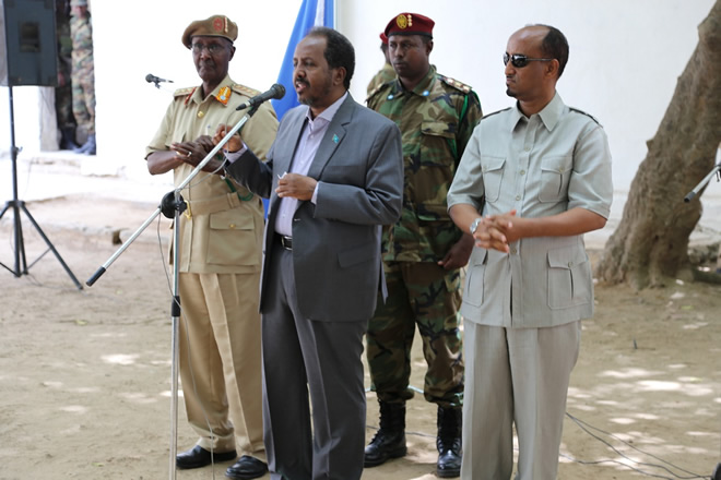 Arbaco, August 28, 2013 (HOL) — Madaxweynaha dowladda Soomaaliya, Xasan Sheekh Maxamuud ayaa maanta kormeeray taliska cusub ee qaybta 12-ka Abriil ee ciidanka xoogga dalka iyo taliska guud wasaaradda gaashaandhigga Soomaaliya.