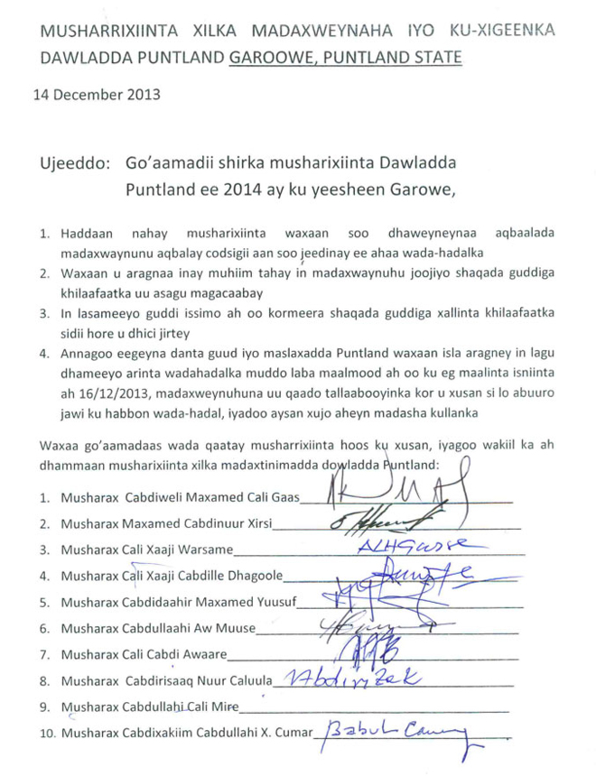 Baaqa Musharraxiinta oo nuqul kamid ah lasoo gaarsiiyey xafiiska Hiiraan Online ee Puntland, ayaa lagu sheegay in ay muhiim tahay in la joojiyo shaqada Guddiga Xallinta Khilaafaadka ee uu madaxweynuhu dhowaanta soo magacaabay, islamarkaana la sameeyo guddi isimmo ah oo kormeera sida ay howshu u socoto.