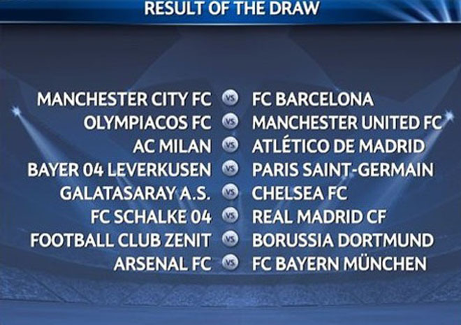Isniin, December 16, 2013 (HOL) — Waxaa lagu dhawaaqay isku aadka 16-ka kooxood ee u soo baxay wareeggii labaad ee koobka horyaalka kooxaha qaaradda Yurub ee loo yaqaan UEFA Champions League, waxaana arrrinta xiisaha badan ay tahay inay isku aadeen kooxaha Arsenal Vs Bayern Munich iyo kooxaha Barcelona Vs Manchester City.