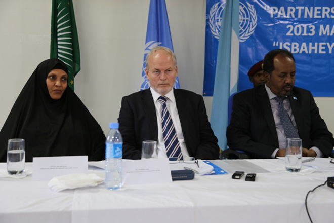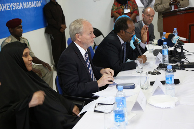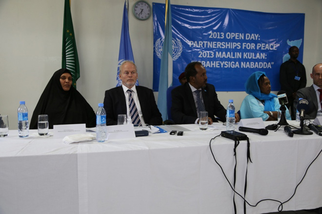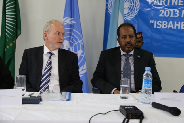 Arbaco, December 04, 2013 (HOL) — Madaxweynaha Soomaaliya, Xasan Sh. Maxamuud ayaa maanta ka qayb-galay kulankan lagu soo gaba-gabeynayay xarunta AMISOM ee Muqdisho, kaasoo looga hadlayay doorka haweenku ay ku leeyihiin ka hortagga tacadiyada ka dhanka ah haweenka iyo kaalinta ay ku leeyihiin horumarka dalka, iyadoo xiritaanka kulankan ay goob-joog ka ahaayeen, wasiirka horumarinta adeegga bulshadda, Maryan Qaasim, dajire Nicholas Kay, danjirayaasha dalalka Talyaaniga, Sweden u jooga Somalia iyo mas’uuliyiin kale.