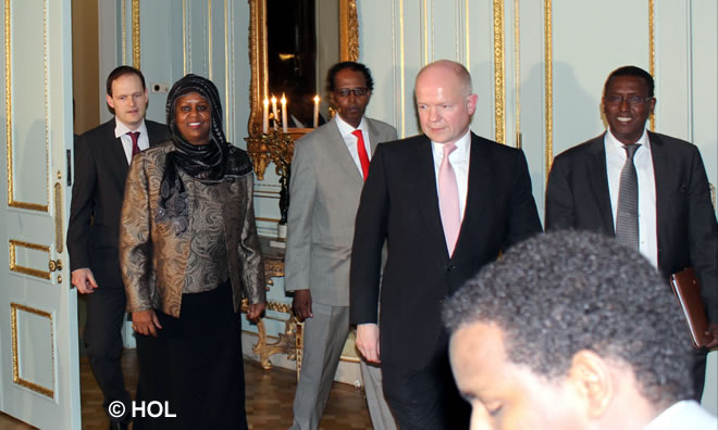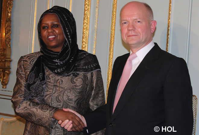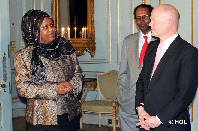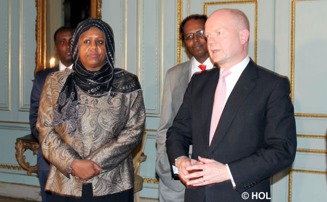 Khamiis, Jannaayo 03, 2013 (HOL) — Wasiirradda arrimaha dibadda ee Soomaaliya, Fowziyo Yuusuf Xaaji Aadan iyo wasiirka arrimaha dibadda ee dalka Britain, William Hague ayaa maanta kulan ku yeeshay magaalada London ee xarunta dalka Britain, waxayna kulankooda kaga hadleen xoojin xiriirka labada dal iyo arrimo kale.