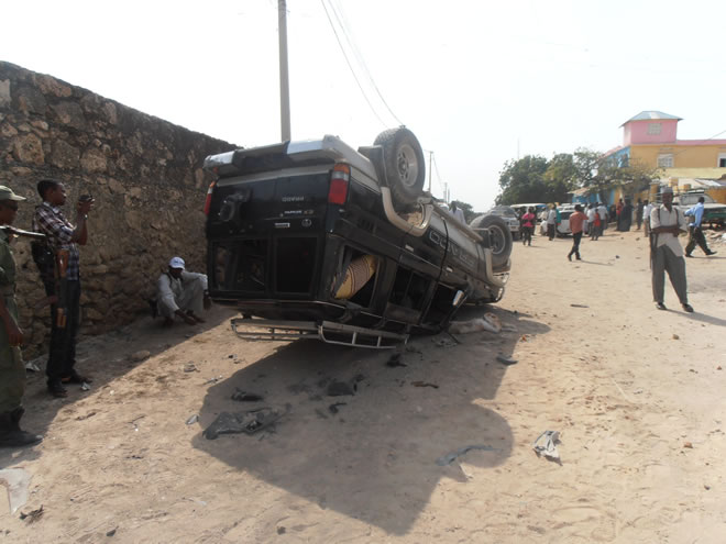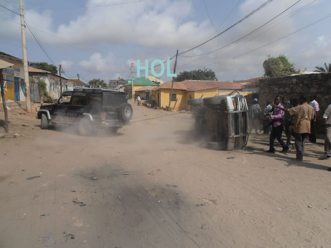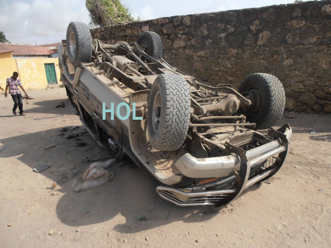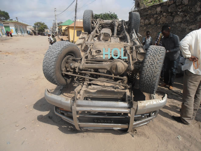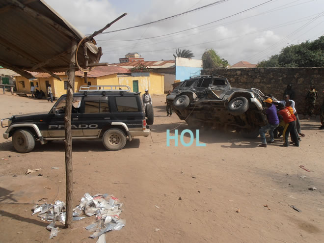 Axad, July 14, 2013(HOL):- Qarax xooggan ayaa maanta gudaha magaalada Kismaayo lagula eegtay gaadiid ay wateen ciidamo ka tirsan kuwa nabadsugidda maamulka, waxaana qaraxaasi ku dhaawacmay wadihii gaariga iyadoona sidoo kale uu ku burburay gaarigii lala beegsaday.