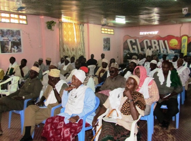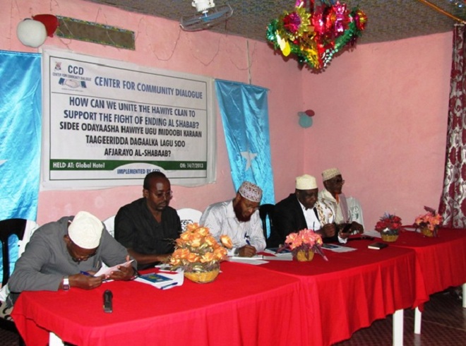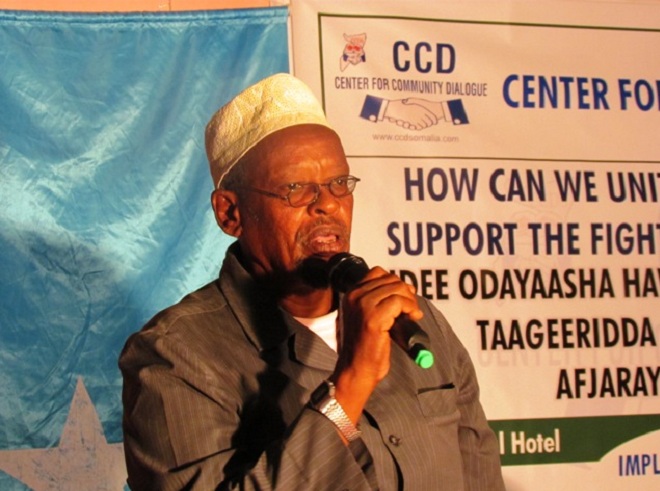 Axad, July 14, 2013 (HOL) — Kulan weyn oo looga hadlayay sidii odayaasha dhaqanka ay ugu midoobi lahaayeen taageerada dagaalka ka dhanka ah Al-Shabaab ayaa maanta ka dhacay magaalada Muqdisho, kaasoo ay ka qayb-galeen madax-dhaqameedyo, odayaal, waxgarad iyo guddoomiyaha hay’ada wadahadalka bulshada, Ciise Axmed Cumar.