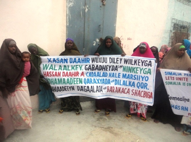 Axad, July 07, 2013 (HOL) — Dibadbaxayaal haween u badan ayaa maanta ka dhigay Muqdisho bannaanbax ay ku dalabnayeen in dowladda Soomaaliya ay maxkamad soo taagto Sheekh Xasan Daahir Aweys, waxayna dadkan wateen boorar ay ku qoran yihiin inuu yahay gacan-ku-dhiigle dad badan dilay.