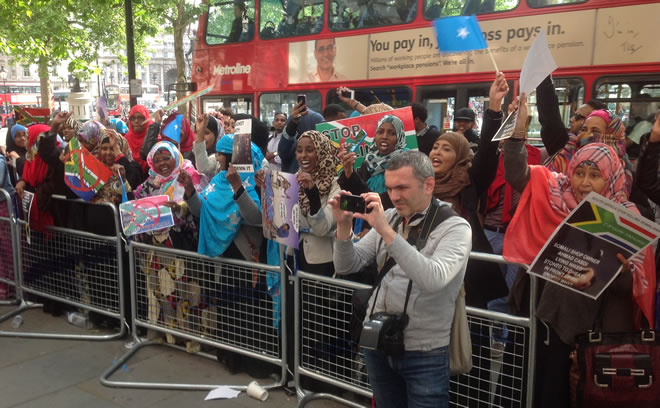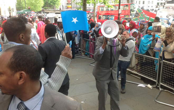 Magaalada London ayaa waxaa isugu soo baxay boqolaal Soomaali ah oo ku qaylinayo erayo ay ku codsanayeen in lagu joojiyo dhibaatooyinka Soomaalida ku nool dalka Koonfur Afrika lagu hayo.