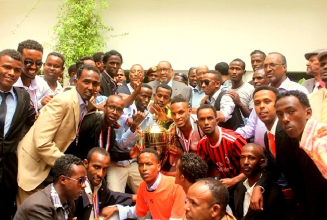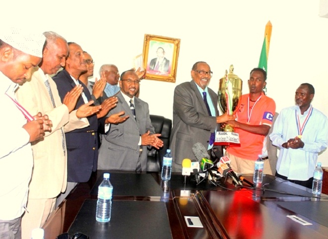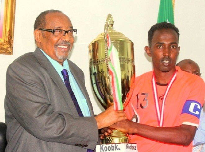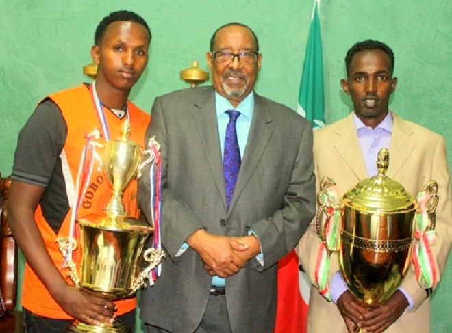 Sabti, Juun 22, 2013 (HOL) — Madaxweynaha Somaliland, Axmed Maxamed Maxamuud Siillaanyo ayaa maanta qasriga madaxtooyadda ku qaabilay labadda gobol ee ku kala guulaystay koobka kubadda cagta iyo koobka kubadda Gacanta ee basketka looyaqaan.