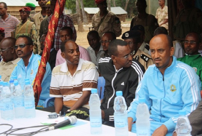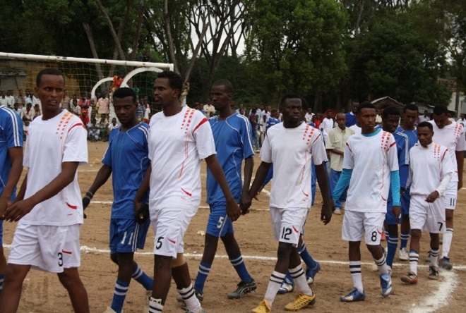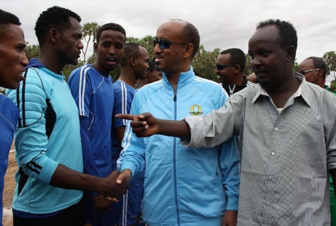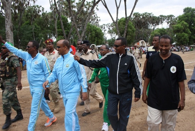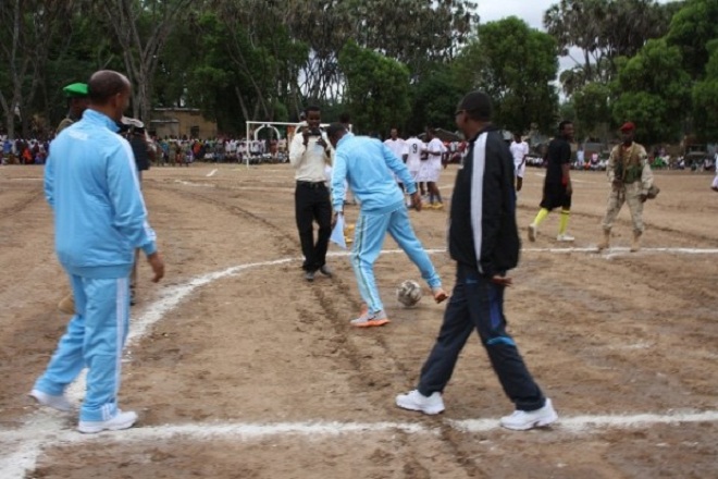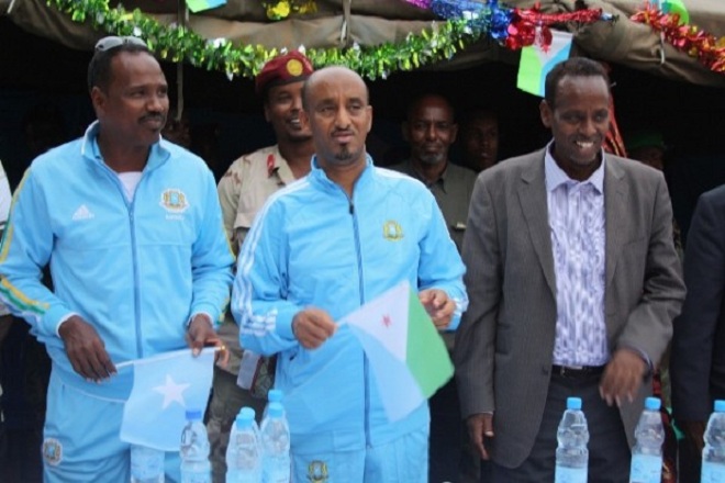 Arbaco, Juun 26, 2013 (HOL) — Wafdiga uu horkacayo wasiirrka difaaca xukuumada Soomaaliya C/xakiin Xaaji Max'uud Fiqi, safiirka dowladda Jabuuti, mas'uuliyiinta maamulka gobolka Hiiraan, saraakiisha ciidamada Jabuuti iyo dadweyne isaga kala yimid xaafadaha magaalada Baladweyne ayaa galinkii danbe ee maalintii shalay ka wada qeyb-gallay daawashada gabadbada tartanka kubada cagta oo maalmihii ugu danbeeyay ka soconayay magaalada Baladweyne.