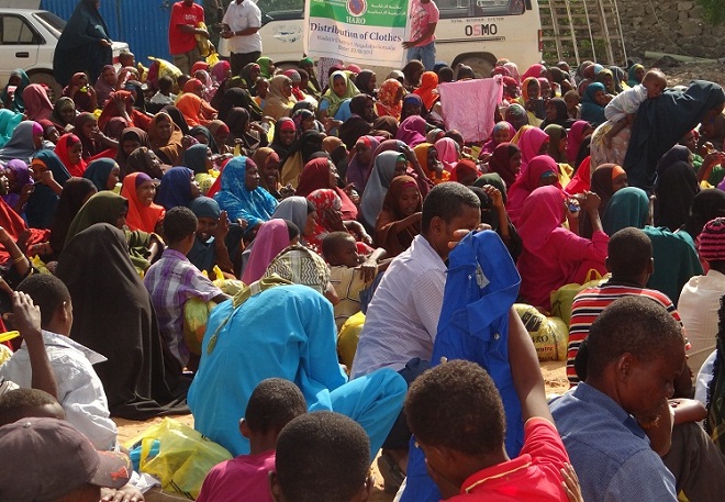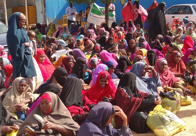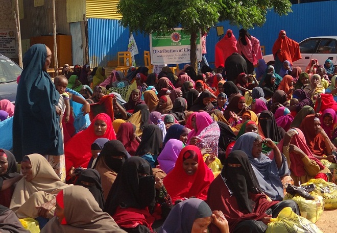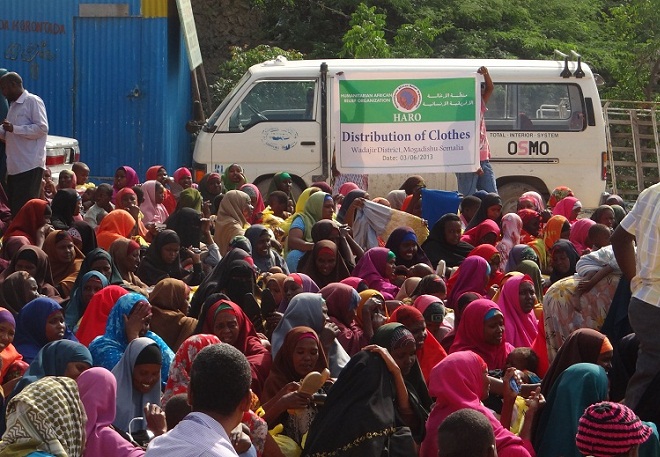 Mas’uuliyiin ka tirsan xafiiska HARO ee Muqdisho ayaa deeqdan u qaybiyay dadka u baahan, waxaana ay isugu jireen dharka ragga, dumarka iyo caruurta iyadoo boorsooyinkana ay isugu jireen kuwa dharka lagu rito iyo kuwa ay dumarka garbaha ku qataan.