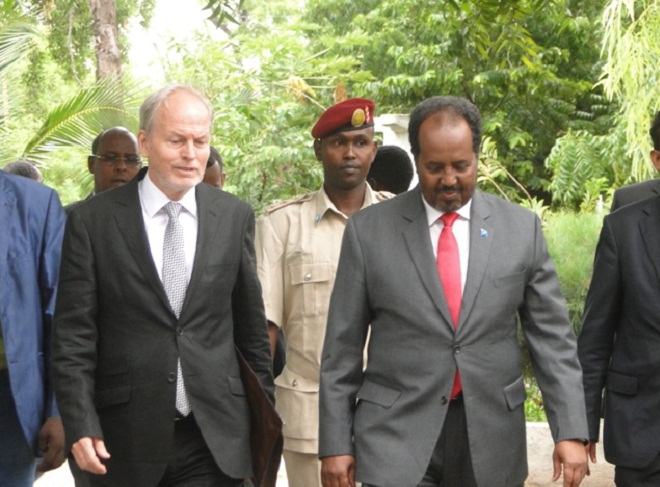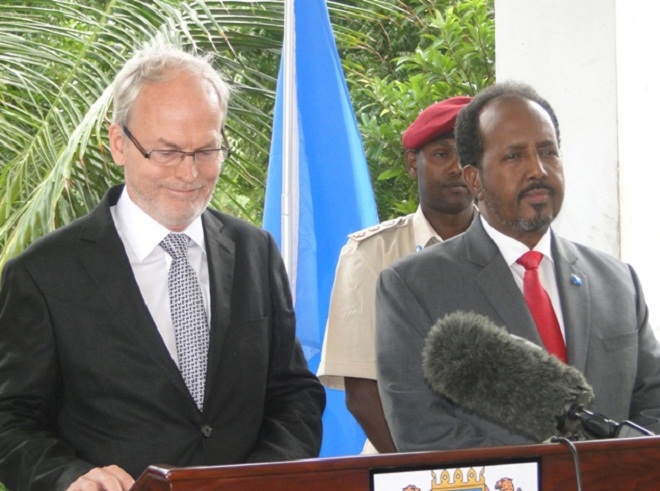Sabti, Juun 08, 2013 (HOL) — Madaxweynaha Soomaaliya, Xasan Sheekh Maxamuud oo maanta dib ugu soo laabtay Muqdisho ayaa ugu baaqay dadka Soomaaliyeed inay la shaqeeyaan ergeyga cusub ee xoghayaha guud ee QM uu u soo magacaabay Soomaaliya iyo xafiiskiisa cusub ee UNSOM.