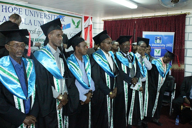 Isniin, Maarso 11, 2013 (HOL) — Jaamacadda Hope ayaa maanta 19-arday guddoonsiisay shahaadada Master-ka ah, kuwaasoo sagaal ka mid ah ay ku suganayeen magaaladaMuqdisho, halka 10-ka kalena ay joogeen magaalada Hargeysa ee xarunta Somaliland, iyadoo munaasabaddii Muqdisho ay kasoo qaybgaleen mas’uuliyiin uu ka mid ahaa guddoomiyaha baarlamaanka Soomaaliya, Prof. Maxamed Cismaan Jawaari.
