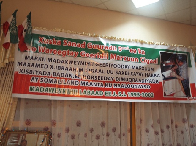 Sabti, May 04, 2013 (HOL) — Munaasibad lagu xusayey sanadguuradii 11aad ee ka soo wareegtay geeridii ALLE ha u naxariisktee Maxamed Xaaji Ibraahim Cigaal Madaxweynihii laabaad ee Somaliland, ayaa xalay lagu qabtay Hoteel Maansoor ee Magaalada Hargeysa, kaas oo ay ka soo qaybgalleen boqolaal dadweyne oo iskugu jira dhalinyarada iyo ardayda jaamacadaha.