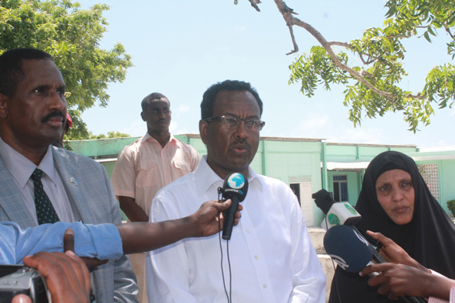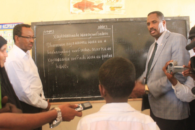 Axad, November 10, 2013 (HOL) — Ra’iisul wasaaraha Soomaaliya, mudane Cabdi Farax Shirdoon (Saacid) ayaa maanta booqasho ku kala bixiyay qaar ka mid ah iskuulladii ay dib u howlgalisay wasaaradda horumarinta Adeegga Bulshada, kuwaasoo qayb ka ah barnaamijkii AADA DUGSIYADA, hotel Maka Al-Mukarama oo qarax lala beegsaday habeen hore iyo isbitaalka Madiina oo ay ku jiraan dhaawacyada dadkii ku wax-yeelloobay qaraxyadii Muqdisho ka dhacay.