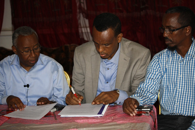 Arbaco, November 13, 2013 (HOL) — Waxaa maanta hoteelka City Plaza ee magaalada Muqdisho shir jaraaid si wadajir ah ugu gabtay mas’uuliyiin ka kala tirsan garabto uu u kala qaybsanaa ururka dhakhaatiirka Soomaaliyeed kuwaasoo shaaciyay inay midoobeen isla markaana doorteen hoggaan KMG ah oo shaqeynaya lixda bilood ee soo socota.