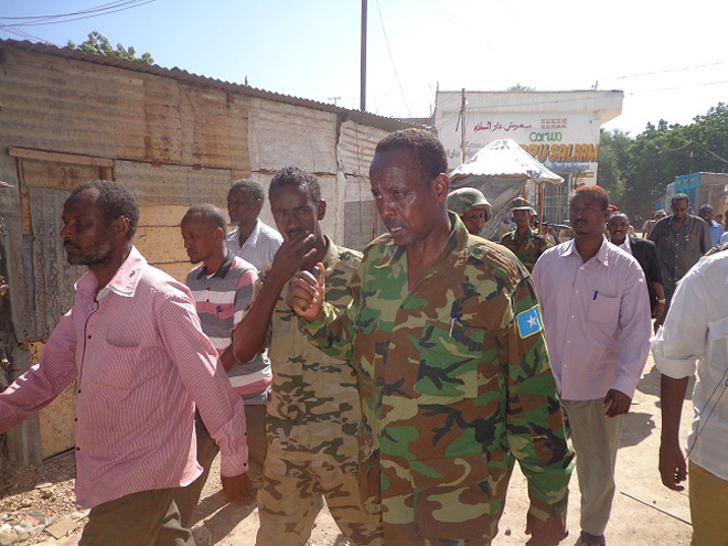 Arbaco, November 20, 2013 (HOL) — Guddoomiyaha maamulka gobolka Hiiraan Cabdi Faarax Laqanyo oo ay wehliyaan xubno ka tirsan maamulka iyo saraakiil ciidan, ayaa maanta socod ku soo maray xarumaha iyo waliba saldhigyada ciidamada maamulka gobolka Hiiraan, kadib weerarkii Ismiidaminta ahaa ee maalintii shalay ka dhacay ilinka hore ee saldhiga booliiska magaalada Beledweyne.