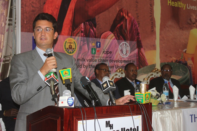 Talaado, November 26, 2013 (HOL) — Madaxweynaha Somaliland, Axmed Maxamed Maxamuud Siilaanyo ayaa ka qayb-galay mashruuc lagu horumarinayo caanaha xoolaha Somaliland oo ay ku baxayso afar milyan iyo afar boqol oo kun oo lacagta midowga Yurub ah.