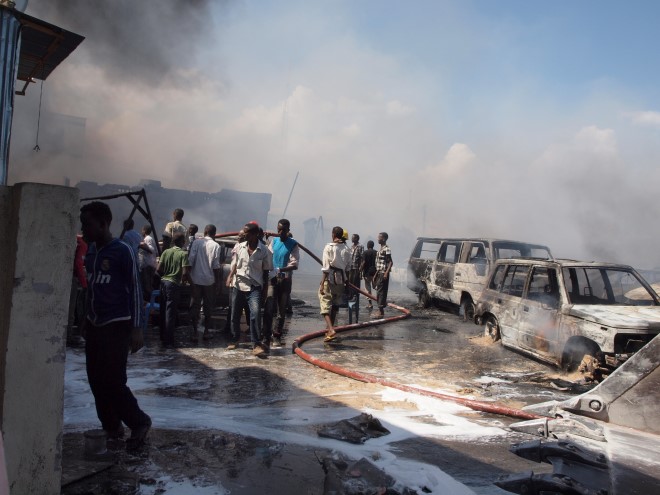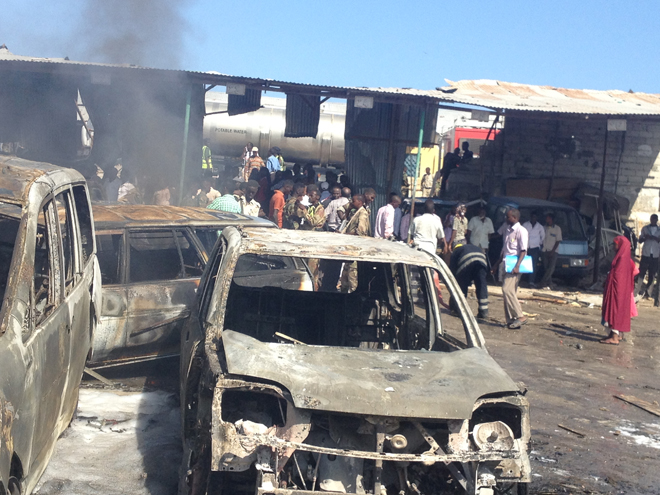 Khamiis, November 28, 2013 (HOL) — Dab xoog leh ayaa maanta ka kacay garaash weyn oo lagu iibiyo gaadiidka ganacsiga loo keeno dalka iyo shidaal, waxaana dabkaas uu bur-buriyay dhismayaal fara badan oo halkaas ku yaallay.