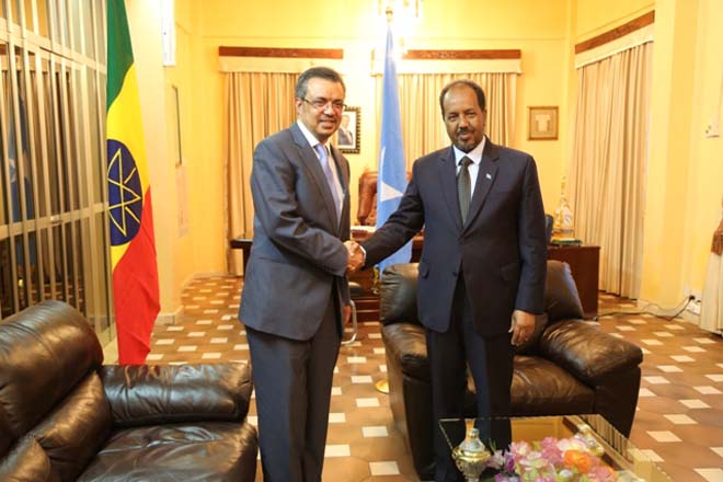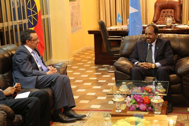 Talaado, November 05, 2013 (HOL) — Madaxweynaha iyo ra’iisul wasaaraha Soomaaliya Xasan Sheekh Maxamuud iyo Cabdi Faarax Shir-doon (Saacid) ayaa galabta si gooni-gooni ah ugu qaabilay Muqdisho wasiirka arrimaha dibadda ee Itoobiya, Tedros Adhanom iyo wafdi uu horkacayo, iyagoo kala hadlay arrimaha horumarinta xariirka labada dowladood iyo sidii nabad loogu soo dabaali lahaa geeska Afrika.