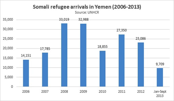 Sagaalkii bilood ee ugu horreysay sannadkan 2013, waxaa dalka Yemen hab qoxooti ahaan ah ku galay 9,709 ruux oo Soomaali ah, kuwaasoo hay’adda qoxootiga Adduunka ee UNHCR ay diiwaan-gelisay.