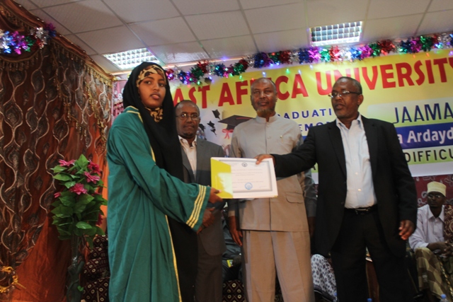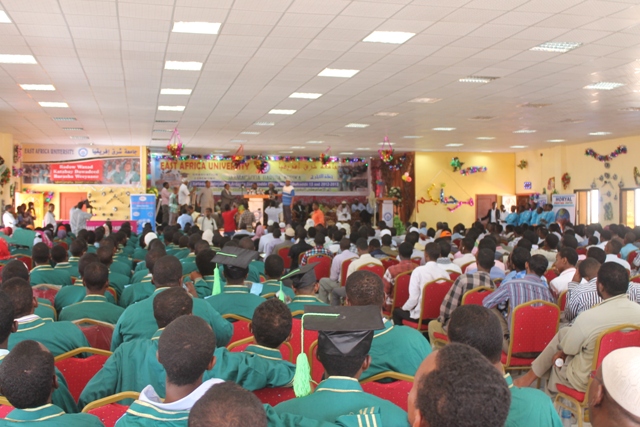 Khamiis, Oktoobar 31, 2013 (HOL) — 596 arday oo labadii sano ee ugu dambeeyey ka baxay kulliyadaha kala duwan ee Jaamacadda Bariga Afrika, ayaa maanta waxaa xaflad ay ku qalin jabinayeen oo aad u ballaarneyd loogu qabtay hoolka jaamacadda ee magaalada Boosaaso.