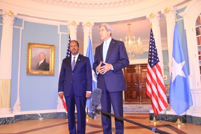 Sabti, September 21, 2013 (HOL) — Madaxaweynaha Somalia, Xasan Sheekh Maxamuud oo safar shaqo ku joogo dalka Mareykanka ayaa kulan la yeeshay xoghayaha arrimaha dibadda Mareykanka, John .F.Kerry, wasiirka gaashaandhigga, Chuck Hagel, la-taliyaha amniga Qaranka, Susan Rice iyo xildhibaan, Keith Ellison.
