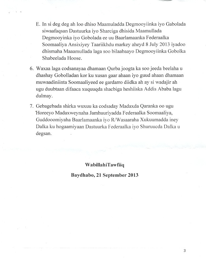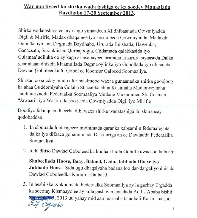 Sabti, September 21, 2013 (HOL) — Shirkii wadatashiga ee maamulka loogu sameynayay lixda gobol ee ka socday magaalada Baydhabo ayaa laga soo saaray maanta war-murtiyeed ay isku raaceen ergooyinkii ka qaybgalayay.