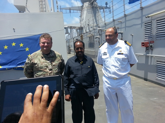 Waa markii ugu horreysay oo madaxweynaha Soomaaliya iyo wafdi la socda ay kulan kaga qayb galaan markab dagaal oo Midowga Yurub laga leeyahay korkiis, iyadoo tani ay macno weyn u sameynayso dowladda Soomaaliya sida kulanka lagu qabtay markabka dushiisa laga sheegay.