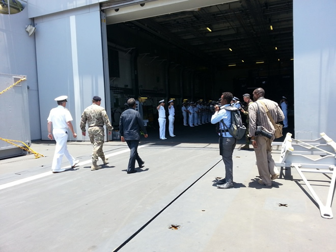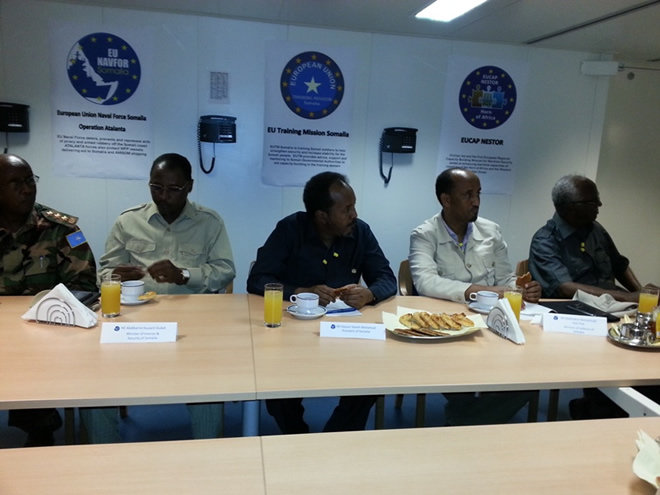 Khamiis, September 05, 2013 (HOL) — Madaxweynaha dowladda Somalia, Xasan Sheekh Maxamuud ayaa shalay meel ka baxsan xeebta Muqdisho wuxuu markab dagaal oo ay leedahay dowlada Nederland kana mid ah kuwa howlgalka la-dagaalanka burcad-badeedda u jooga Soomaaliya kula kulmay ergayga gaarka ah ee Midowga Yurub u jooga Soomaaliya, Michele Cervone d’Urso, taliyaha sare ee ciidmada badda Midowga Yurub, Admiral Bob Tarrant, madaxa hawlgalka dhismaha iyo tayeynta Midowga Yurub (EUCAP), Nestor, Etienne de Poncins iyo xubno kale.