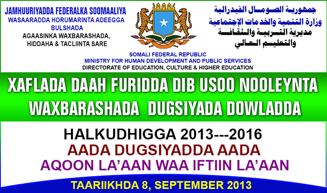 Axad, September 08, 2013 (HOL) — Olole waxbarasho loogu magac-daray aada dugsiyada ayaa maanta si rasmi ah uga furmay magaalada Muqdisho, iyadoo lagu wado in saddexda sano ee soo socota ay hal milyan oo caruur Soomaaliyeed ay helaan waxbarasho lacag la’aan ah.