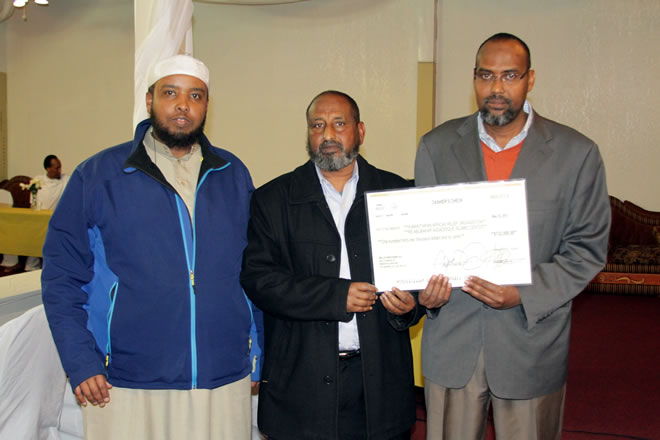 Ugu dambeyn, waxaa jeeggii ay lacagtaas ku saxiixnayd ku wareejiyay madaxa hay’adda HARO Cali Cabdinuur maamulaha guddiga masaajidka Abuubakar Sadiiq ee Minneapolis, C/rashiid Barre.