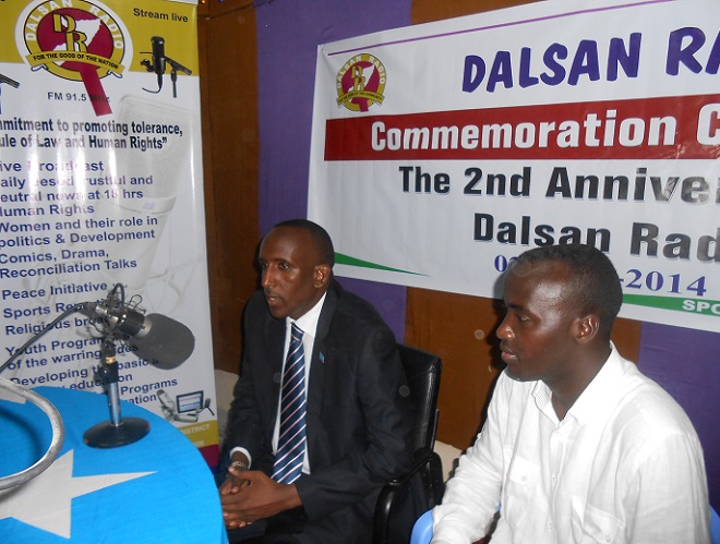 Khamiis, Abriil 03, 2014 (HOL) — Wasiirka warfaafinta xukuumadda Soomaaliya, Mustaf Shiikh Cali Dhuxulow ayaa ka qaybgalay munaasbadda sannad-guuraddii labaad ee kasoo wareegtay markii la asaasay Dalsan Radio.