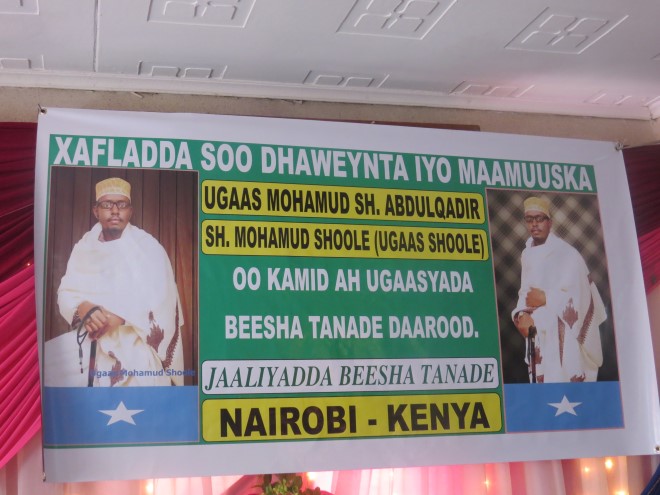 Sabti, August 23, 2014 (HOL) - Xaflad soo dhaweyn ah, ayaa magaalada Nairobi loogu sameeyay Ugaas Maxamed Sheekh Cabdulqaadir Sheekh Maxamuud Shoole oo lagu naaneyso Ugaas Shoole, kana mid ah Ugaasyada Soomaaliyeed. Kaasoo 27-kii bishii June ee sanadkaan lagu doortay degmada Daarasalaam ee ka tirsan Gobalka Mudug.