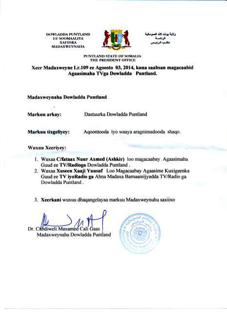 Isniin, August 04, 2014 (HOL) —Magaalada Garoowe waxaa maanta lagu doortay hoggaanka ururka ay ku mideysan yihiin bahda saxaafadda Puntland ee magaciisa loosoo gaabiyo MAP.Doorashada oo saddex qaybood ka koobnayd waxaa lagu doortay guddomiye, guddoomiye ku-xigeen iyo weliba xogheyn, waxaana ka qayb galay 11 murashax oo saddexdaas xil u kala tartamayey.