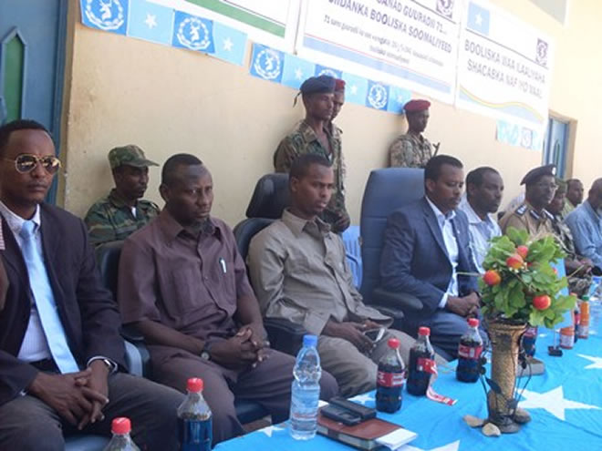 Munaasabada oo lagu qabtay gudaha saldhiga booliiska ayaa waxaa ka qeyb-gallay mas’uuliyiinta maamulka heer gobol iyo degmo, saraakiisha ciidamada booliiska iyo marti-sharaf kale.