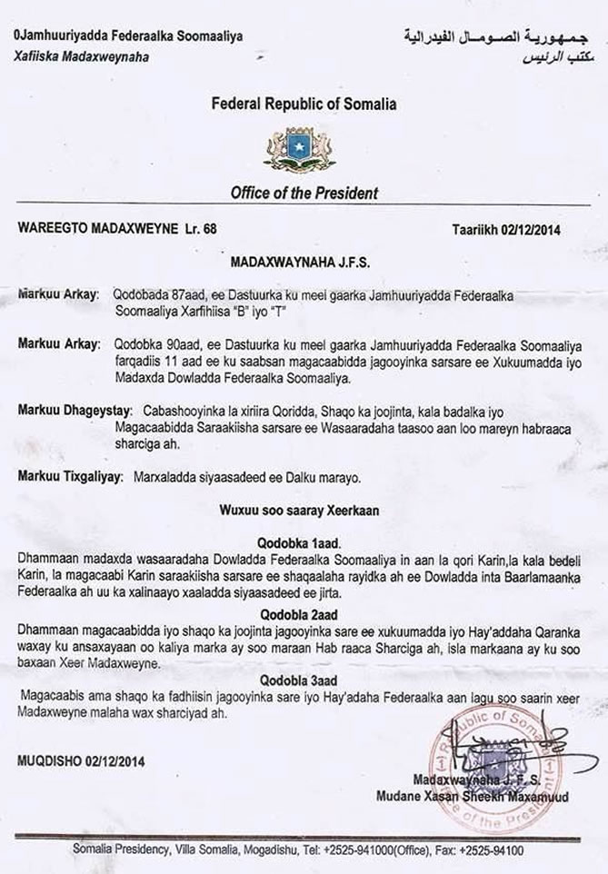Jimco, December 05, 2014 (HOL) — Madaxweynaha Somalia, Xasan Sheekh Maxamuud ayaa wareegto uu soo saaray caawa ku sheegay inaan la ruqseyn karin, la magacaabi karin, isla markaana la dallacsiin Karin shaqaalaha wasaaradaha xukuumadda, isagoo ku sheegay wareegtada inuu isaga oo keliya howlahaas qaban karo.