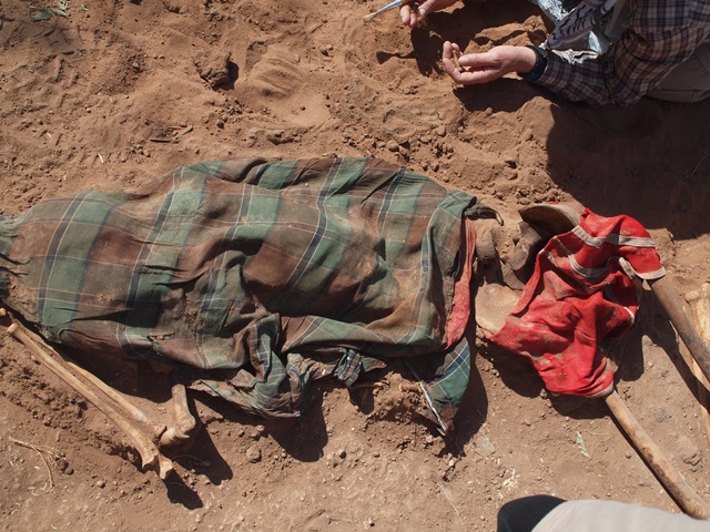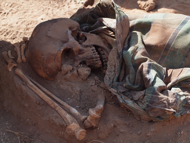 Khuburadan oo si taxadar badan u baadhaya lafaha dadka sida arxandarada ah loogu aasay goob kaliya, isla markaana laga soo saaray lafihii iyo dharkii ay xidhnaayeen ayaa sheegay inay wali wadaan baadhitaankii, isla markaana godkan ka soo saareen lix qof oo dharkii ay xidhnaayeen iyo qalfoofkoodiiba laga soo saaray.