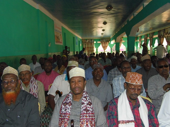 Jimco, Janaayo 10, 2014 (HOL) — Xaflad lagu taageerayay madaxweynaha cusub ee maamul goboleedka Puntland Prof: C/weli Max’ed Cali islamarkaan ay kasoo qeybgaleen masuuliyiin sare oo ka tirsan maamulka Jubba, odoyaal, haween, dhalinyaro iyo guud ahaan qeybaha kala duwan ee bulshada ku dhaqan Degmada Kismaayo ayaa manta ka dhacay Hotel Qiilmawaaye ee magaalada Kismaayo.