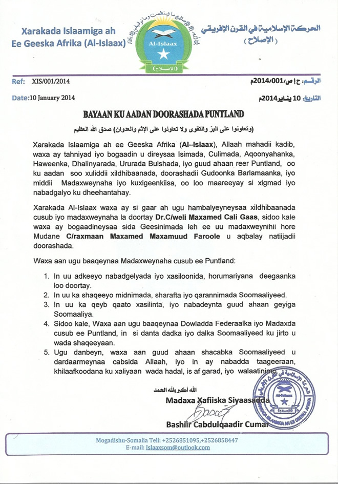 Jimco, Janaayo 10, 2014 (HOL) — Ururka Al-islaax ee Geeska Afrika ayaa bayaan ay uu soo saaray maanta oo Jimco ah hambalyo u diray shacabka, culummada, madaxweynaha Puntland, C/weli Maxamed Cali (Gaas iyo ku xigeenkiisa C/xakiin C/llaahi Camey.