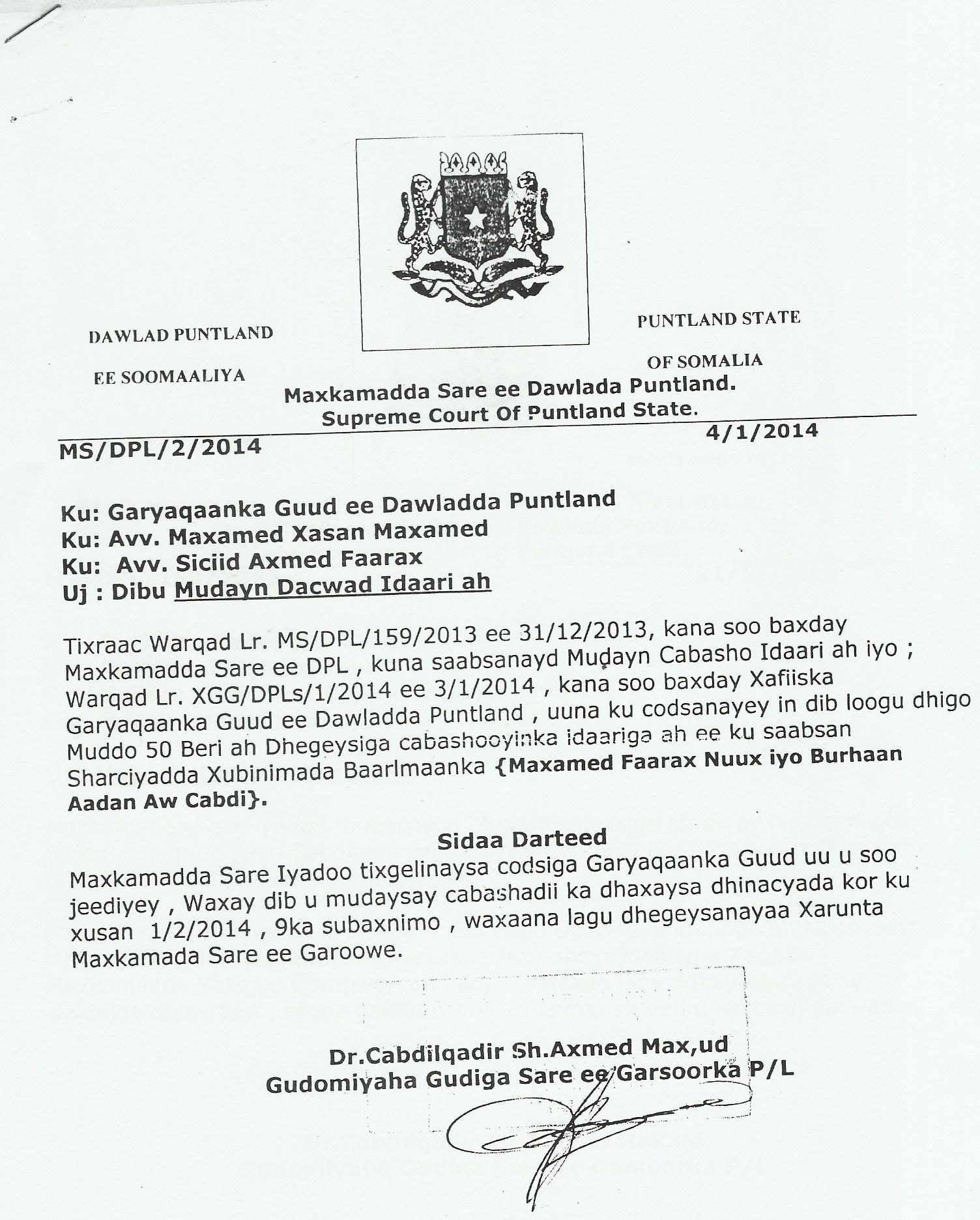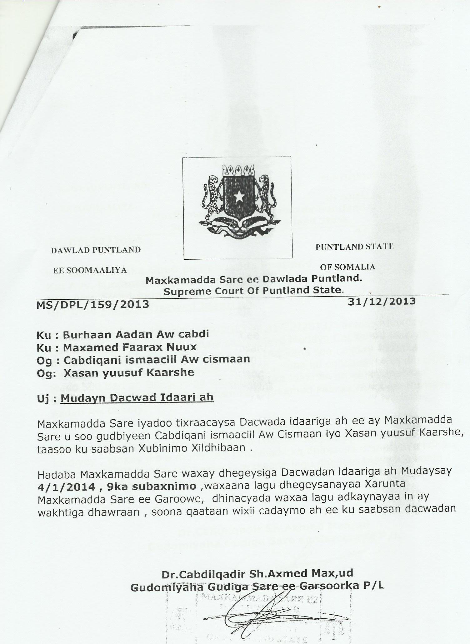 Axad, Janaayo 05, 2014 (HOL) — Maxkamadda sare ee Puntland ayaa dacwad kusoo oogtey labo mudane oo ka tirsan Baarlamaanka Puntland. Xildhibaanadan oo lagu kala magacaabo Burhaan Adaan AW-Cabdi iyo Maxamad Faarax Nuux waxaa dacwad ka dhan ah soo gudbisey beesha ay kasoo jeedaan.