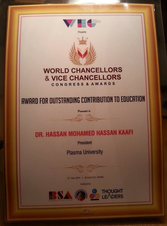 Sabti, June 28, 2014 (HOL) — Jaamacadda Plasma ee fadhigeedu yahay Muqdisho ayaa abaal-marin lagu guddoonsiiyay shirweyne caalami ah oo guddoomiyayaasha jaamacadaha adduunka ay ka qaybgaleen, kaasoo maanta lagu soo gaba-gabeeyay dalka Hindiya.